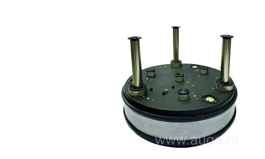 Het aggregaat is geheel compleet en kan in een waterbassin opgesteld en waterpas afgesteld worden, met de stelschroeven aan de onderzijde.