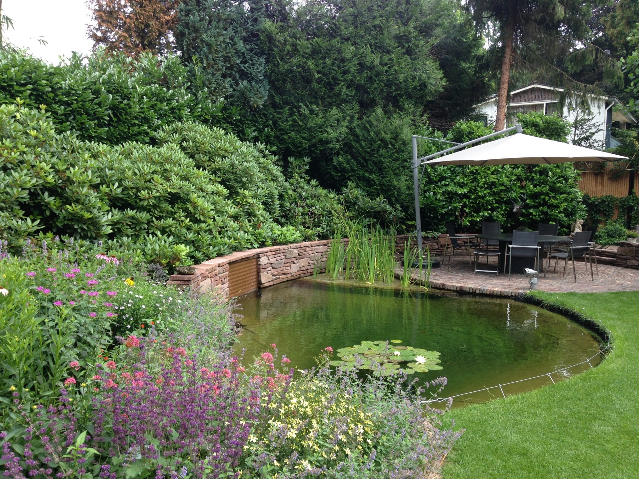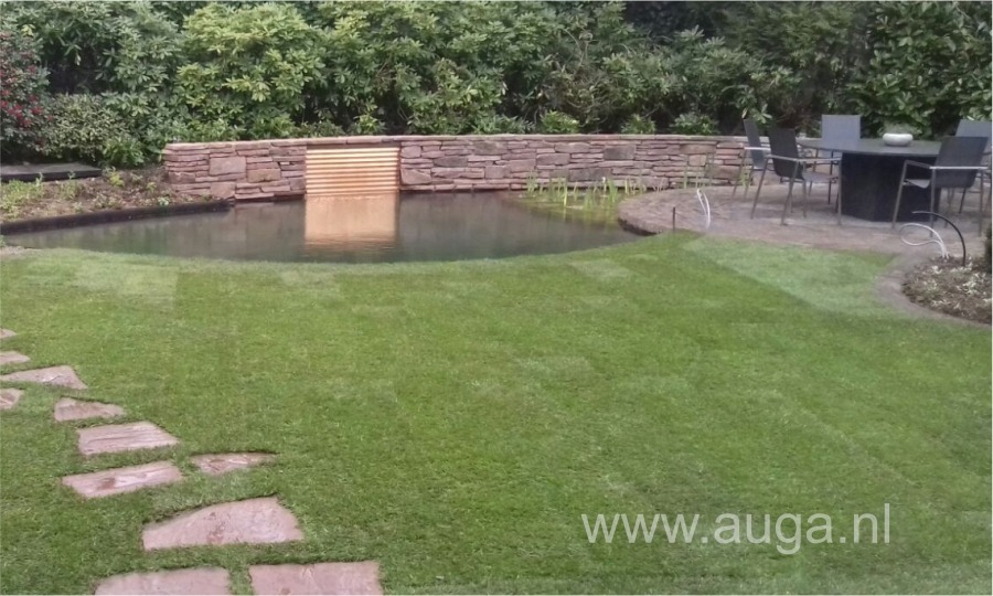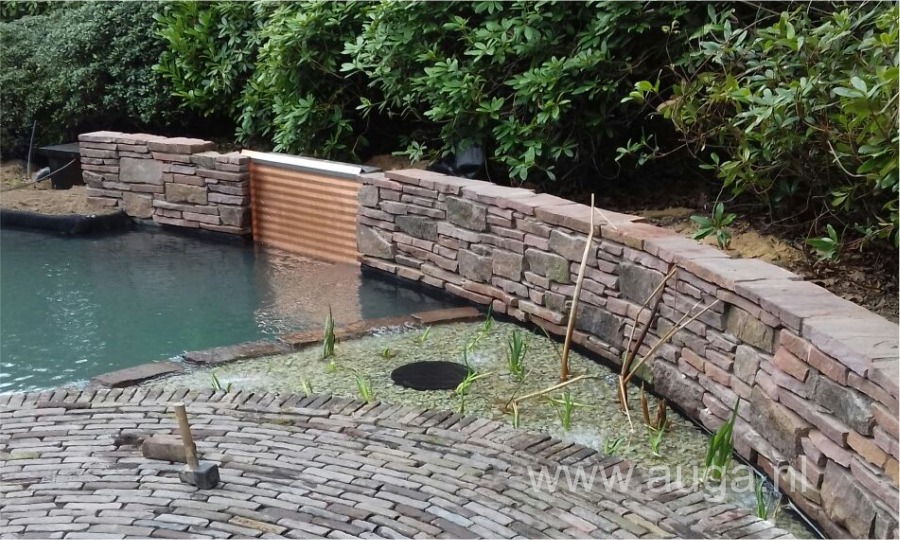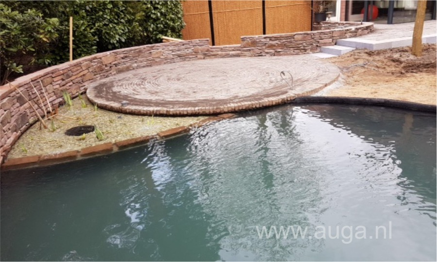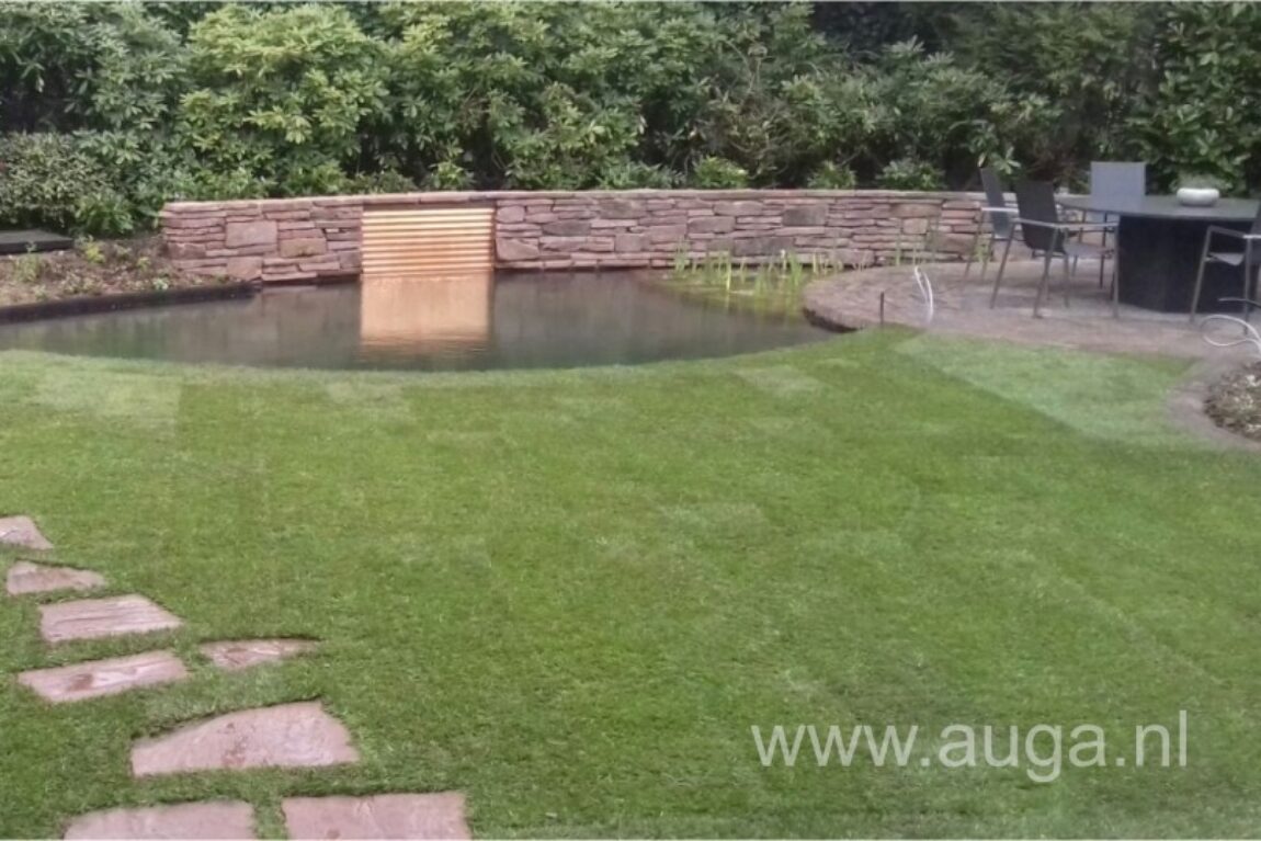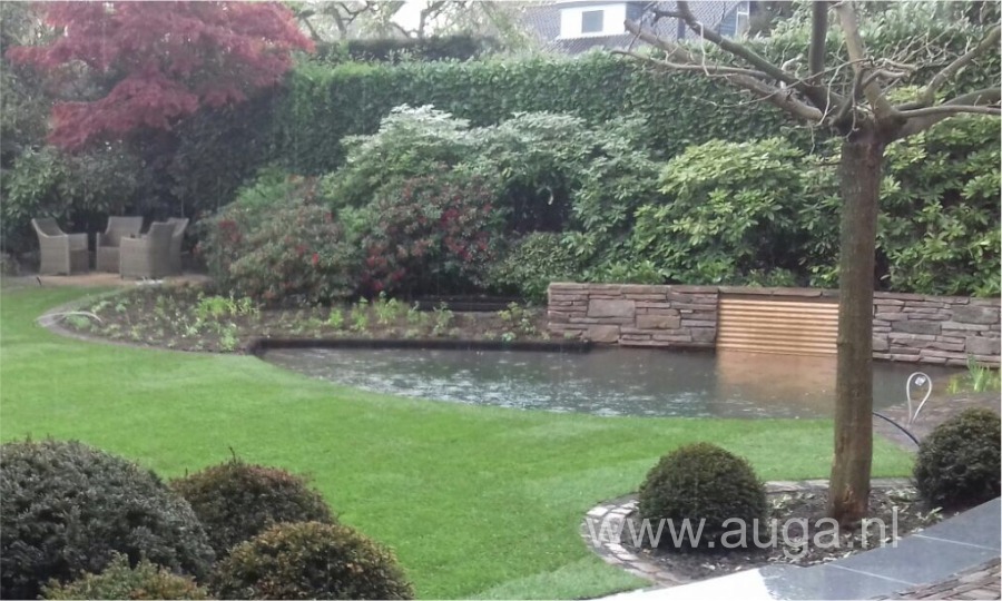 Deze mooi aangelegde vijver is ontstaan in samenwerking met Hoveniersbedrijf Harry Esselink uit De Heurne, gelegen in de Gelderse Achterhoek. Het water in deze vijver wordt biologisch gezuiverd. Dit wil zeggen dat een klein gedeelte van de vijver wordt gebruikt als helofytenfilter: wat een duur woord is voor natuurlijke filtratie met waterplanten en substraat.