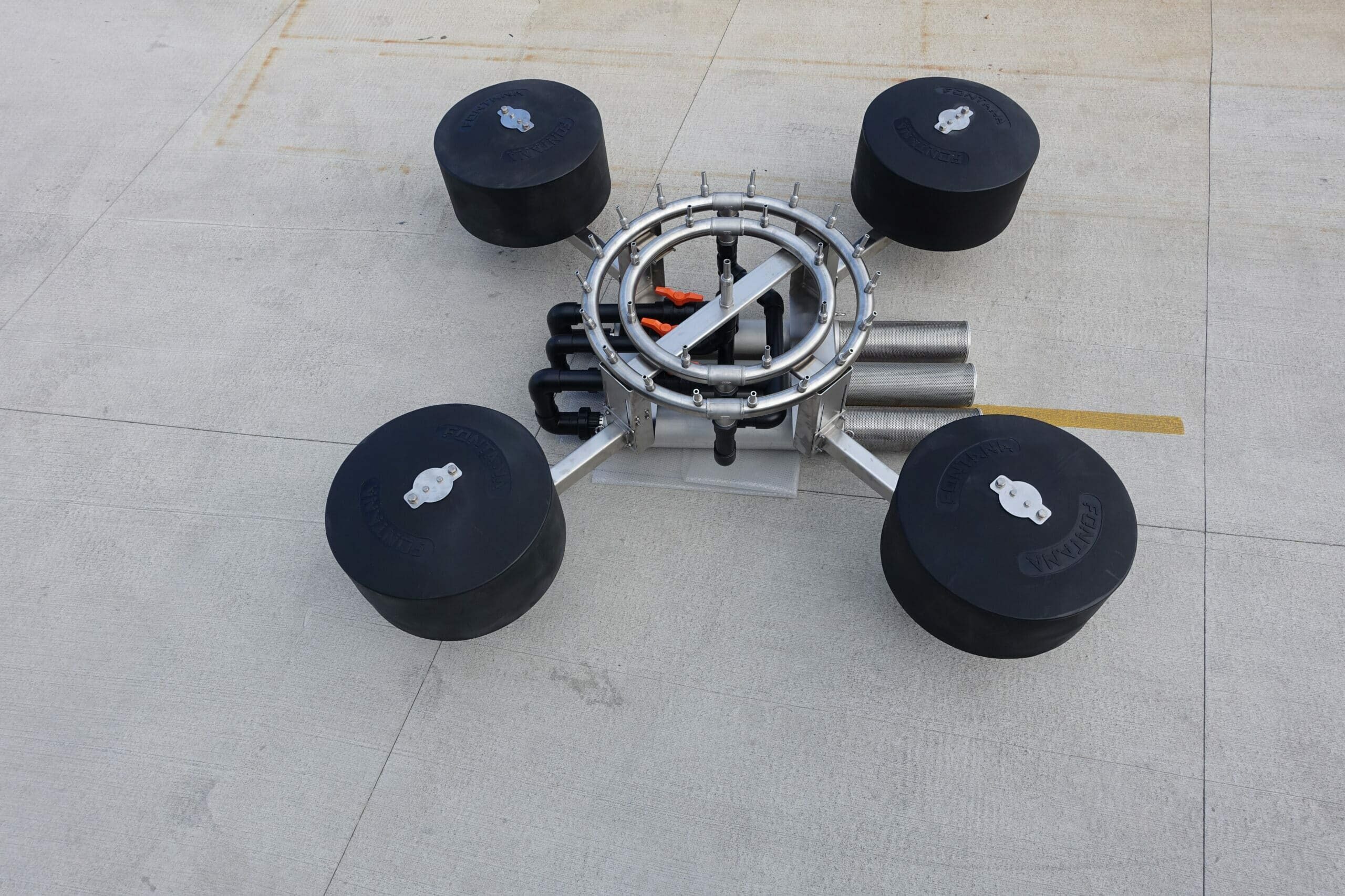 Met een afmeting van 3×3 meter en een hoogte van nog geen meter, is deze drijvende fonteinset in praktisch elke waterpartij in te zetten. De constructie past als een bouwdoos in elkaar en is uiterst gemakkelijk te vervoeren en snel te monteren.