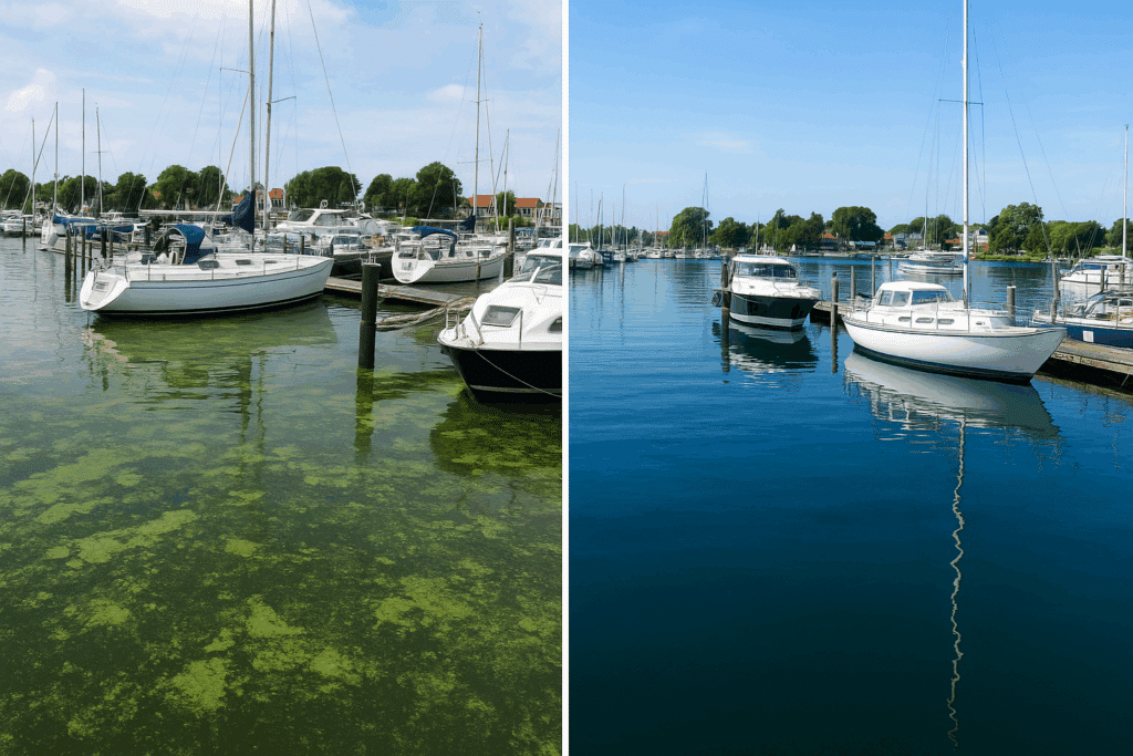 Voorbeeld van een haven met veel algenvorming, die verdwijnen na inzet van een MegaFlow -Combi mixer/beluchter.