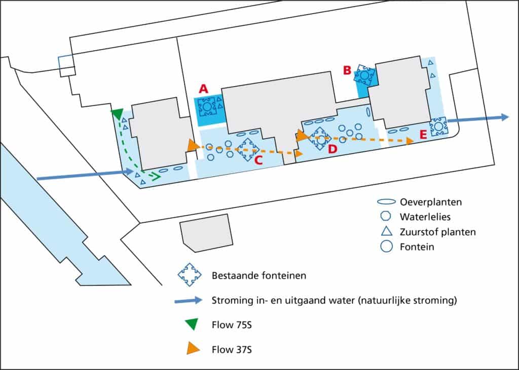Bij Gro-Up was een verbinding met open water aanwezig, maar nauwelijks sprake van goede doorstroming. In de verschillende inhammen stond water stil en daar kon kroos zich snel uitbreiden. De aanwezige fonteinen (A t/m E in de illustratie) zijn waarschijnlijk ooit bedacht om beweging in de vijver te brengen, maar dat is met fonteinen nauwelijks mogelijk.