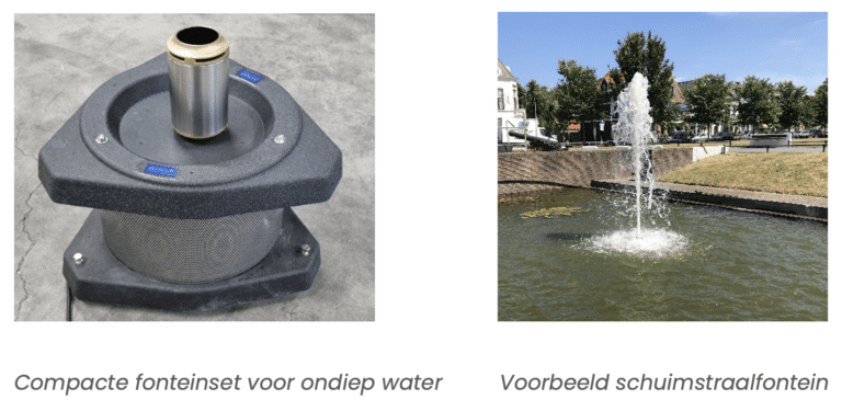 De keuze viel op 2 schuimstraalfonteinen; robuuste waterzuilen die zuurstof met water mengen en een “witwaterstraal” effect geven, die visueel erg goed zichtbaar zijn en bovendien het vijverwater met zuurstof verrijkt. De pompsets zijn verlaagd, zodat deze in de ondiepe vijvers passen. Maatwerk is een vanzelfsprekende optie waarmee we aan de wensen van onze klanten kunnen voldoen.